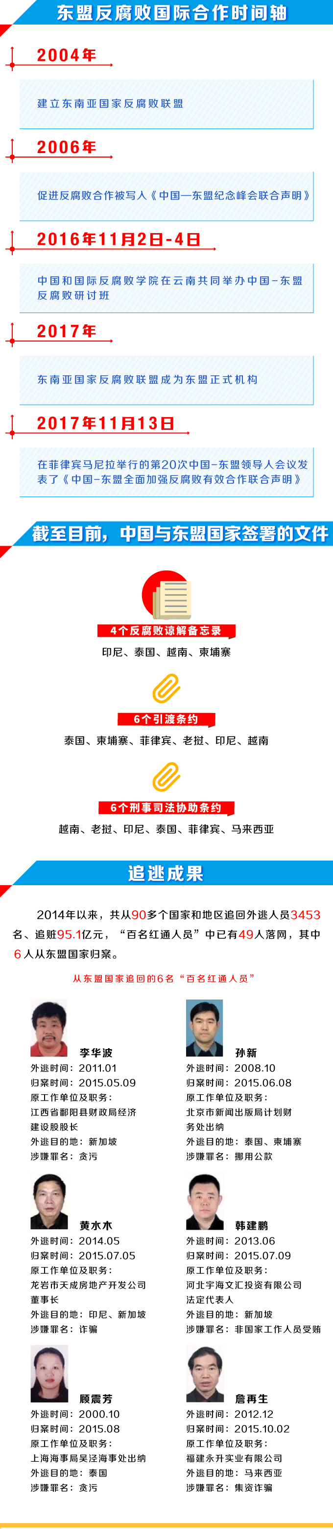 作为山水相连的友好邻邦,中国同东盟国家反腐败交流合作由来已久。早在2006年,中国与东盟建立对话关系15周年时,促进反腐败合作就被写入《中国-东盟纪念峰会联合声明》。2016年11月,中国-东盟反腐败研讨班在云南举办,开启中国和东盟在反腐败领域的首个合作项目。今年年初以来,越南、柬埔寨、老挝、印尼、新加坡等东盟国家或政党领导人纷纷到访中国,围绕反腐败等有关话题与中国开展经验交流、互学互鉴。截至目前,中国已同东盟国家签署4个反腐败谅解备忘录、6个引渡条约、6个刑事司法协助条约。加强合作是手段,评价合作成效则要看个案的实际解决情况。近年来,中国与东盟国家反腐败合作成果堪称有目共睹。2015年中国公布“百名红通人员”以来,通过加强司法执法合作,李华波、孙新、黄水木、韩建鹏、顾震芳、詹再生等6名“百名红通人员”先后从东盟国家归案。以“百名红通人员”2号李华波为例,新加坡应中方刑事司法协助请求,不仅于2015年5月9日将其遣返回国,还协助中方没收李华波转移到新加坡的数千万巨额涉案资产,实现了李华波案追逃追赃的双重胜利。