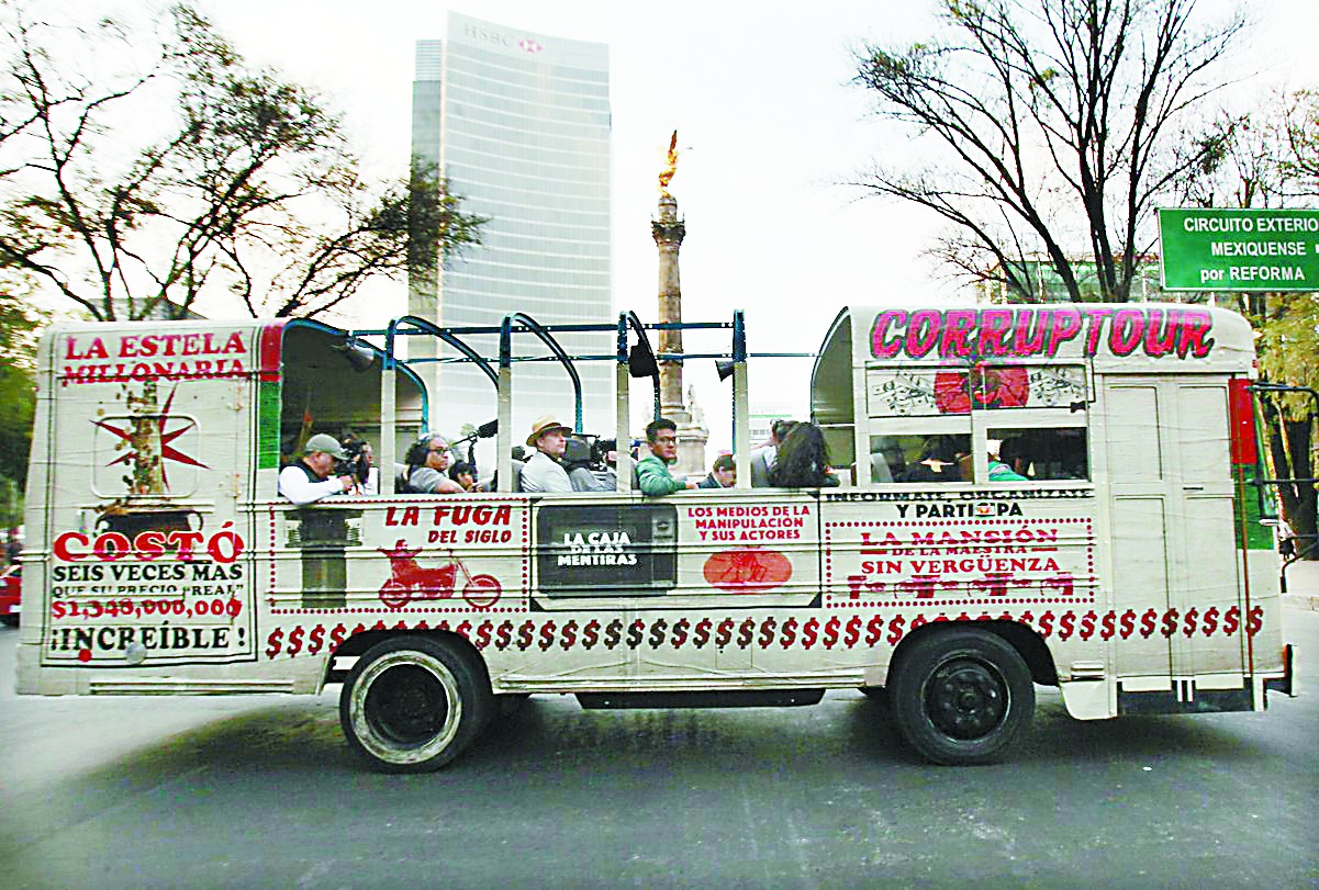 每周日,写着“腐败观光游”的敞篷巴士会从墨西哥国家人类学博物馆出发,载着约30名游客沿着墨城主干道改革大道参观沿线的10处特别的“景点”(如图)。巴士为废旧校车改造,每趟行程安排有两名志愿者,而巴士上的音响会时不时对行程站点作讲解,“这是一个豪宅,有着许多房间、电梯、庭院和一个巨大的游泳池,一层的地面为大理石所铺……如果您看完后觉得应该努力赚钱,今后也买一套这样的豪宅,那您就太天真了,或许一个家庭几辈子的积蓄也换不来这套豪宅……”