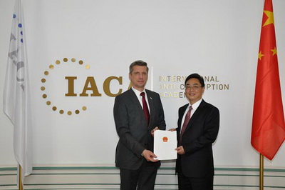 2016年5月3日,中国新任驻维也纳联合国和其他国际组织代表史忠俊大使向国际反腐败学院院长马丁•克鲁特纳递交全权证书。