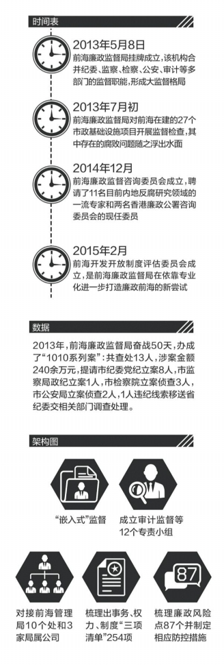 前海廉政监督局刚成立不久即办成“1010系列案”,查处13人涉案金额240余万元等。前海廉政监督局实施“嵌入式”监督,成立审计监督等12个专责小组,对接前海管理局10个处和3家局属公司,并梳理出事务、权力、制度“三项清单”254项,及廉政风险点87个,制定了相应的防控措施。