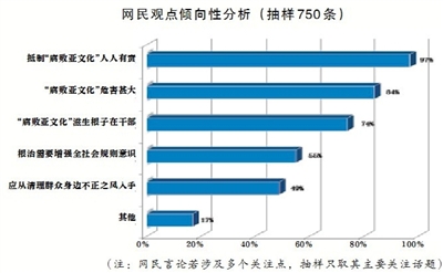 “腐败亚文化”与每个人的切身利益息息相关,广大网民纷纷通过微博、微信、博客、论坛等社交平台发表自己的看法,经抽样统计发现网民主要有以下几方面观点:97%的网民认为,“腐败亚文化”背后的“人情”困局之中,人人都是参与者,人人也都是受害者,因此抵制“腐败亚文化”人人有责,应全民行动;84%的网民表示,“腐败亚文化”会损害主流文化所确定的价值观和社会情感,使整个社会的道德体系崩溃,产生极度恶劣的人文环境,最终影响到经济、政治及文化体制;74%的网民称,“腐败亚文化”滋生蔓延,有法不依和执法的变通、任性是重要原因,根子在干部不受约束,不能运用法治思维做出公正决定,甚至处处想着腐败一把,民众则会迎合这种倾向,“腐败亚文化”也就有了滋长的土壤;55%的网民强调,根治“腐败亚文化”需要增强全社会的规则意识;49%的网民建议,消除社会“腐败亚文化”需要从清除政风腐败的“主文化”入手,在持续“打虎”的同时,还需要下沉“拍蝇”,下大气力治理发生在群众身边的“微腐败”。此外,还有17%的网民表达了其他观点。如有网友提醒,“腐败亚文化”折射建设服务型政府还在路上,需要加快服务型政府建设步伐,在资源相对匮乏之时,更应该加大政务信息公开力度,使办事程序更加公开透明。